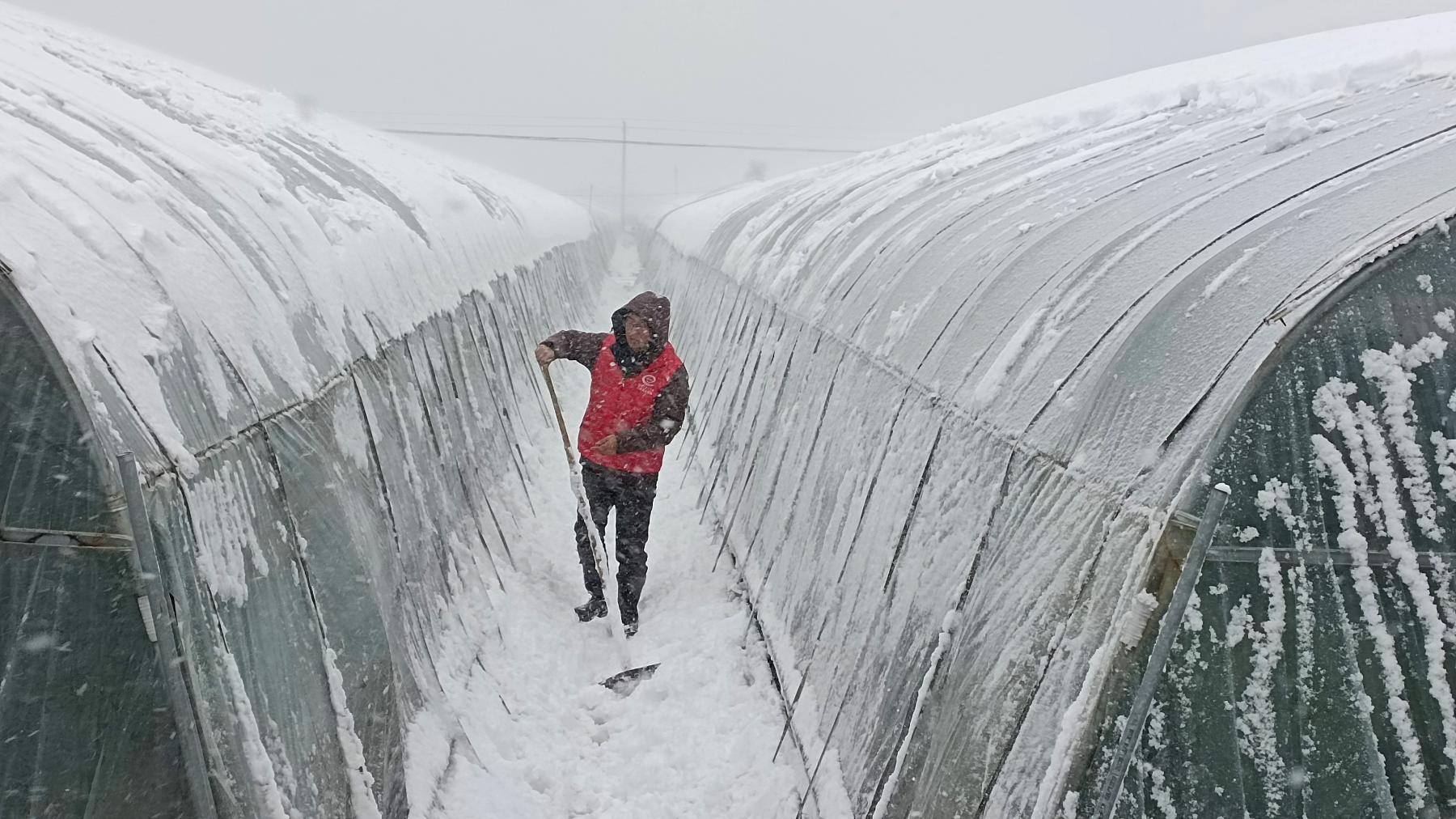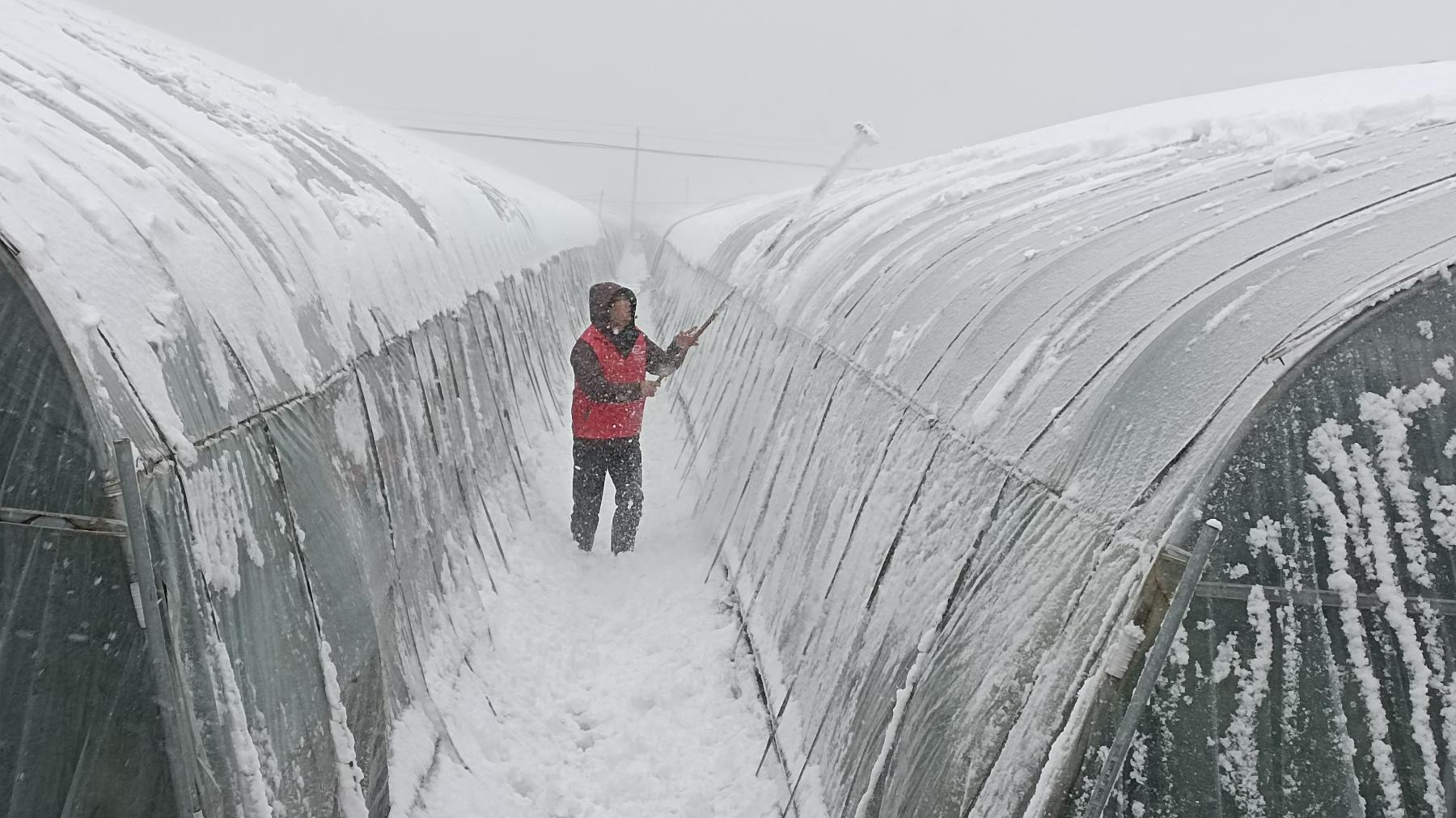 12316经作专家黄国东在上湖辣椒产业园组织菜农对蔬菜大棚扫雪抗灾
